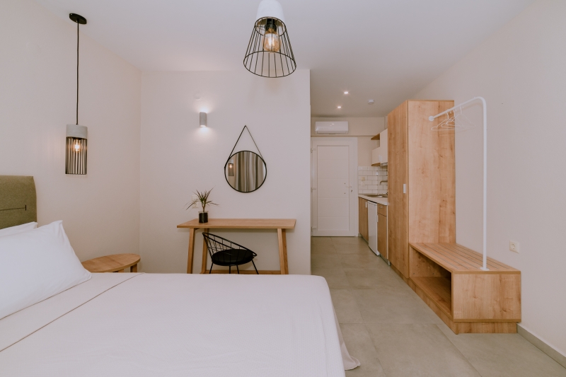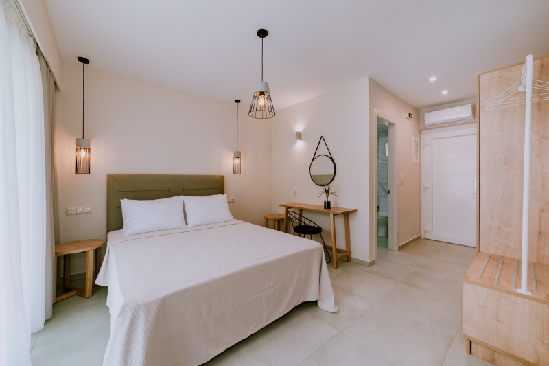 Τα δίκλινα δωμάτια μας, σχεδιάστηκαν για να σας προσφέρουν την απόλυτη άνεση και να προσδώσουν μια αίσθηση διακριτικής πολυτέλειας στη διαμονή σας. Διαθέτουν ένα άνετο διπλό κρεβάτι, ένα μαρμάρινο μπάνιο, μία πλήρως εξοπλισμένη κουζίνα και ένα ευρύχωρο επιπλωμένο μπαλκόνι περίπου 8 τ.μ. με άμεση πρόσβαση στον κήπο και στην πισίνα μας.