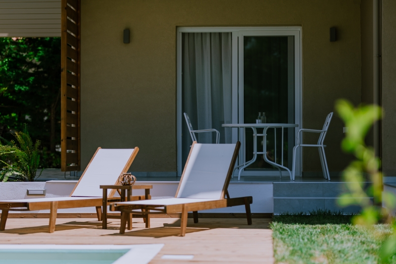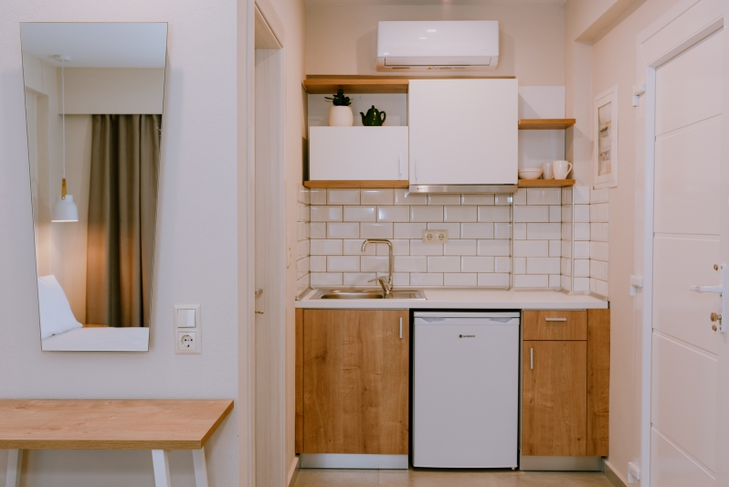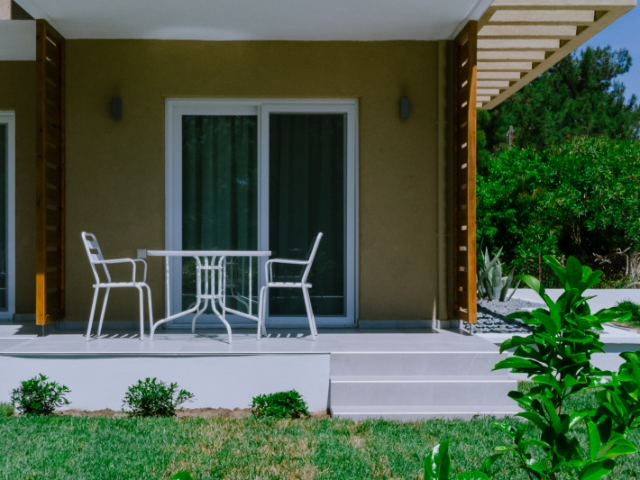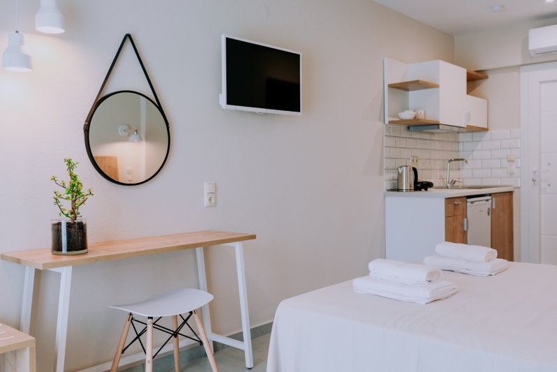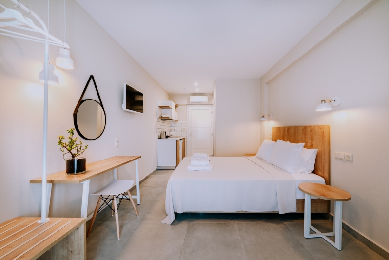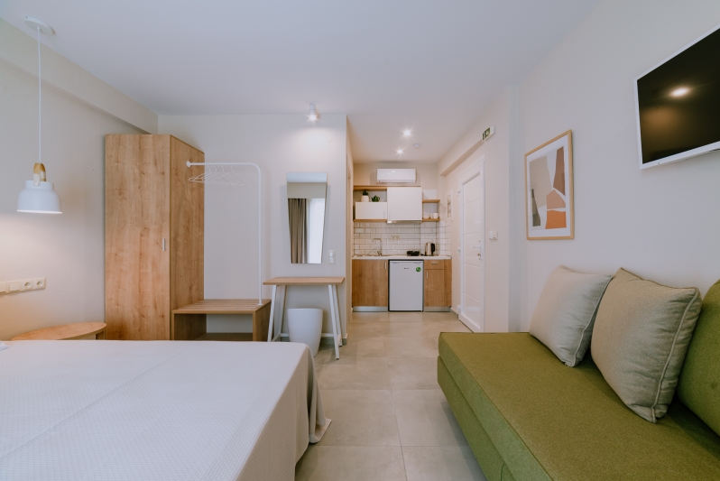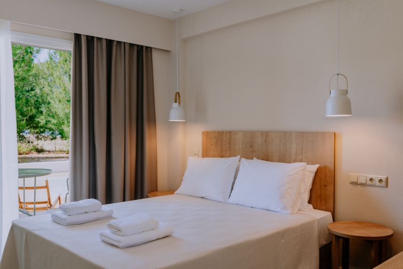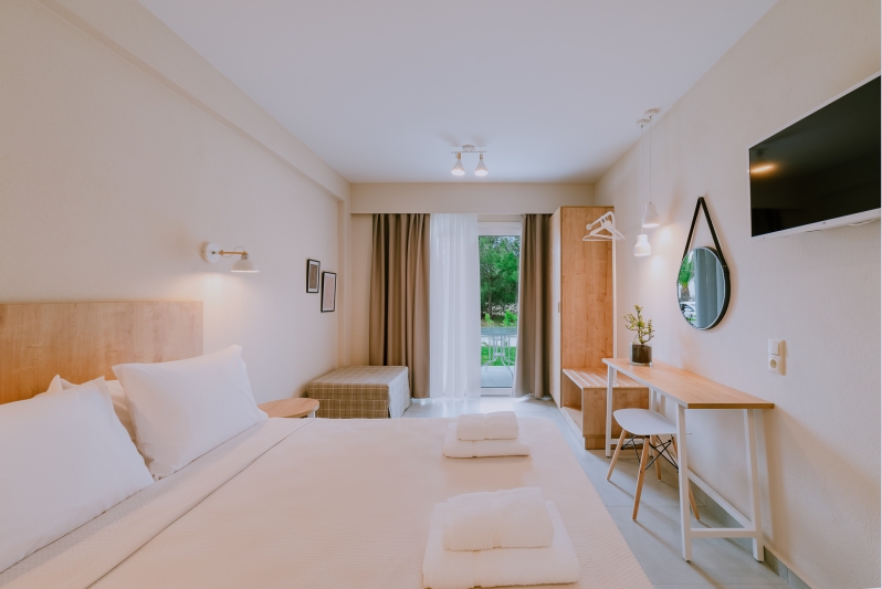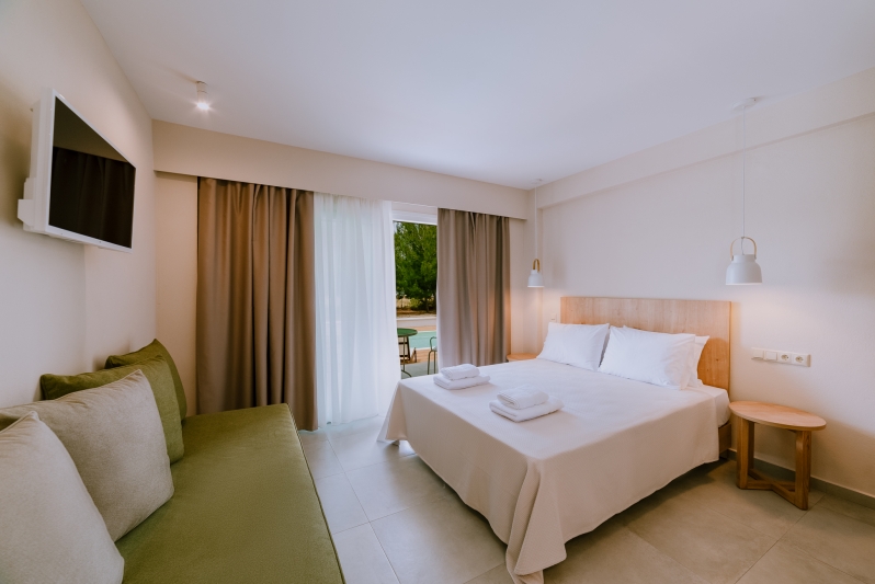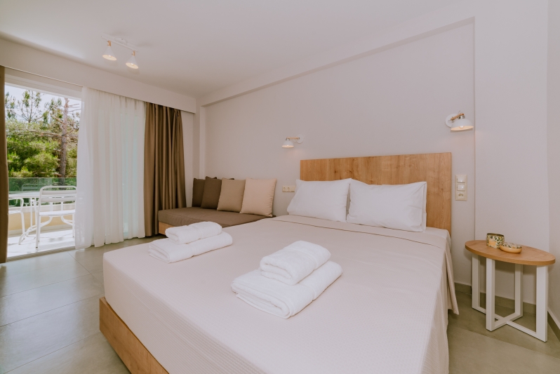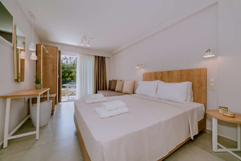 Τα τρίκλινα δωμάτιά μας υπόσχονται να σας χαρίσουν ηρεμία και χαλάρωση και την ίδια στιγμή να ενεργοποιήσουν την θετική διάθεσή σας. Διαθέτουν ένα άνετο διπλό κρεβάτι, έναν καναπέ-κρεβάτι που μπορεί να φιλοξενήσει έναν επιπλέον επισκέπτη, ένα μοντέρνο μπάνιο, πλήρως εξοπλισμένη κουζίνα και ένα ευρύχωρο επιπλωμένο μπαλκόνι περίπου 8 τ.μ. με θέα είτε στον κήπο μας είτε στην θάλασσα.